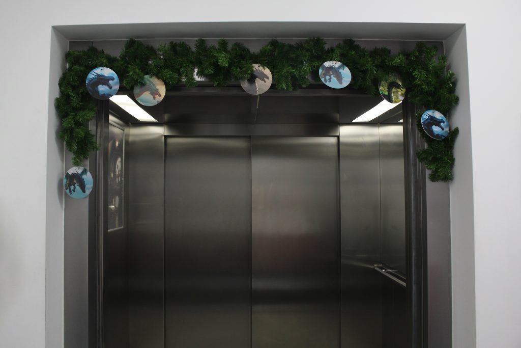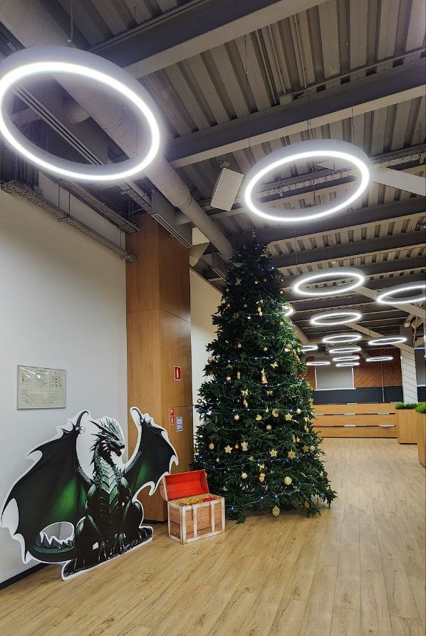 Доминантой праздничного настроения стал медиацентр компании, превратившийся в настоящий дом хоббитов с огромной новогодней елкой и настоящим камином. Дополняют композицию сказочные предметы интерьера, такие как деревянные стулья, стол и бочонок с напитком. Все они выполнены в стиле, характерном для мира Средиземья, и создают атмосферу приближающего праздника. А величественный дракон охраняет сокровища гномов – драгоценные монеты, спрятанные в сундуках.